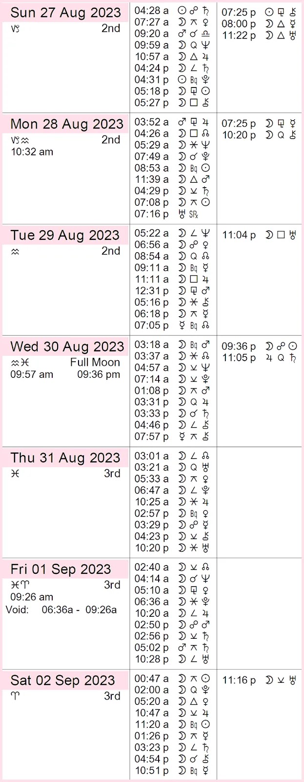 Suitable energy for sailing, swimming, day dreaming, escapism, falling in love, creative writing, especially of poetry, theatre, performances, movies, concerts, music, crowds, solitude, remembering. Charity, water scrying, astral travelling, past life experiences, psychic awakening, bliss. Purchase of swimming gear, boats, surfboards, pets, alcohol, shoes.